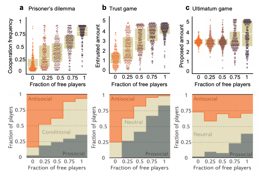 王震教授团队研究了多元决策模式的大规模行为博弈,首次揭示了社交网络能动性(即增加网络中博弈智能体的决策自由度)可以显著激发群体合作、信任与公平等亲社会行为,为完善群体智能涌现理论提供了更充分的科学依据。最新研究成果以 Social networking agency and prosociality are inextricably linked in economic games 为题发表在Nature Human Behaviour 。