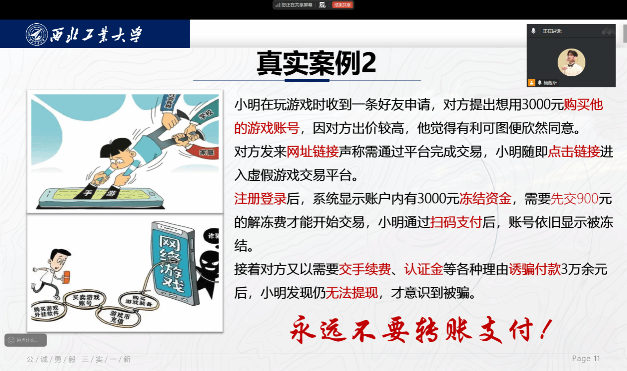 网络深入生活各个角落,多场景、复合型诈骗日益增多,危害青少年财产与信息安全。为提升同学们场景化反诈能力,2月5日杨靓昕同学带来覆盖游戏、校园、交友三大场景的综合反诈课程。课程结合免费游戏皮肤、演唱会内部票等真实案例,揭露诈骗套,总结反诈法则,帮助大家筑牢反诈思维,守护自身安全。