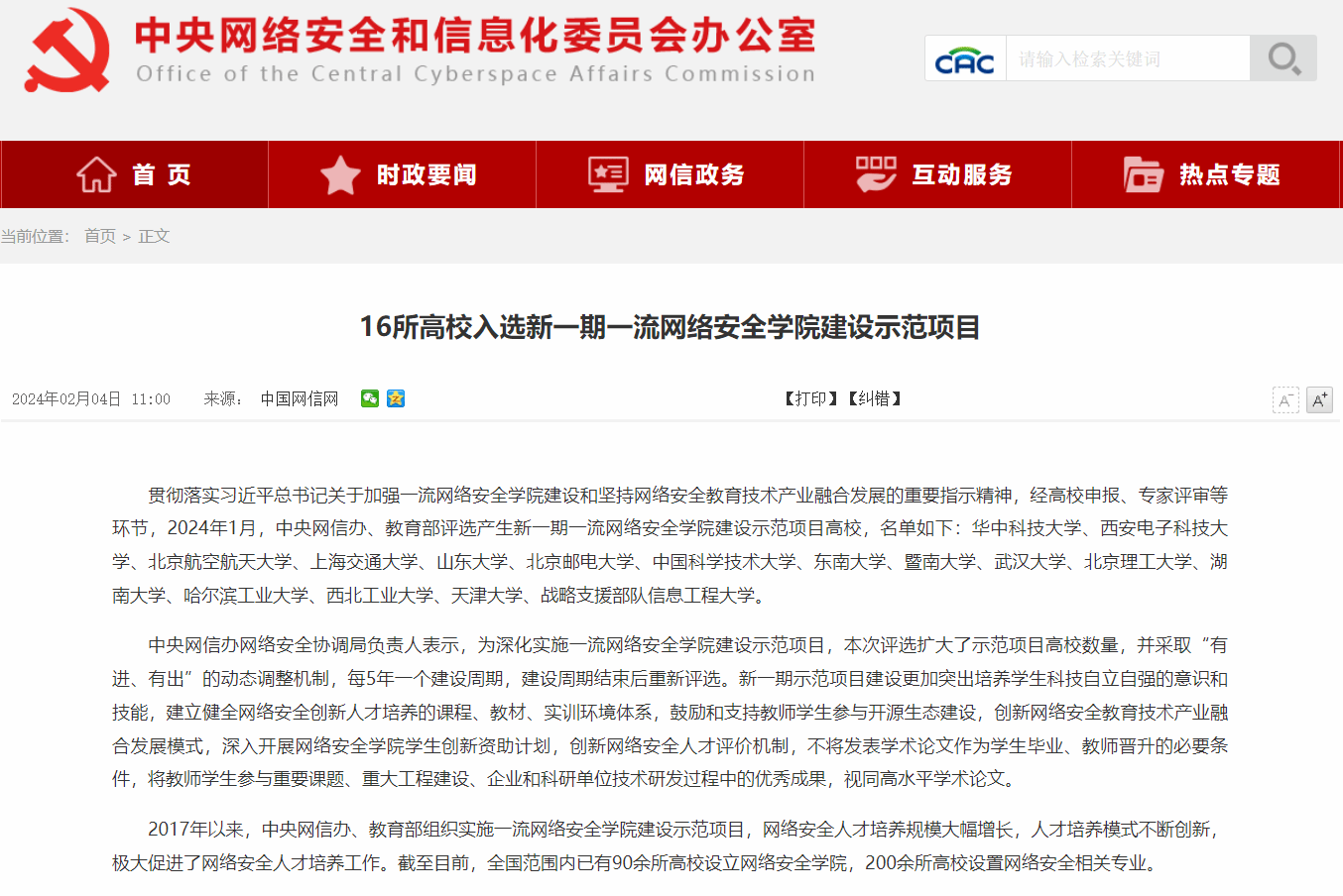链接:16所高校入选新一期一流网络安全学院建设示范项目//www.cac.gov.cn/2024-02/04/c_1708281056653069.htm