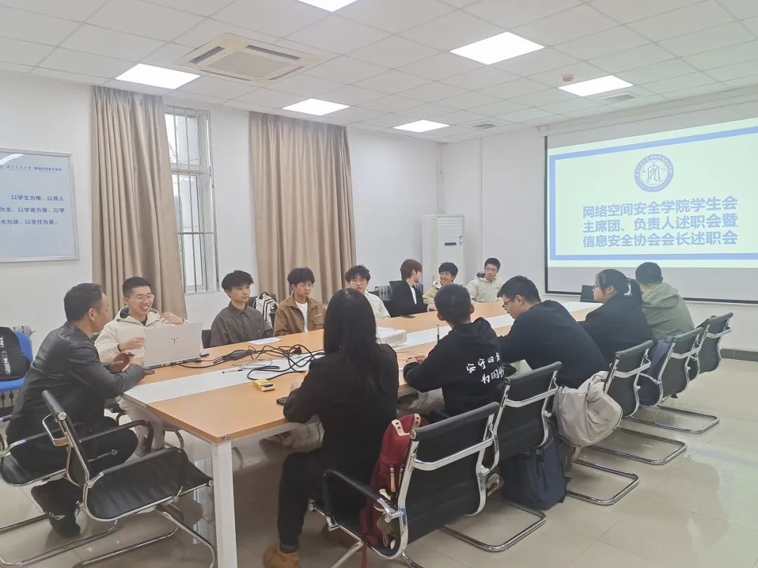 学生组织负责人述职会在学院楼245会议室召开。会议由学院团委书记王昌昌主持,学生会主席团成员与各部门负责人以及信息安全协会会长与会。