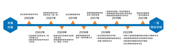 成为教育部认定的15所信息安全类”国家特色专业建设点”高校之一; 2015年获批国家控制布点专业"保密管理”专业,开展辅修双学位人才培养; 2016年获批网络空间安全- -级学科 ,成为获得该学位授权点的全国首批29所高校之一; 2021年获国家级-流专业建设点,学院形成了完备的学科专业体系。