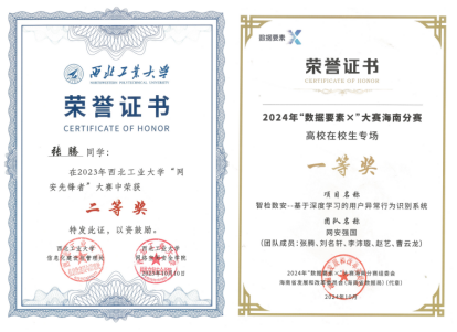 同时,积极承担本科生和研究生专业课程的助教任务,不断提升自身专业素养和实践能力。此外,还多次参加学科竞赛,积极锻炼自己的实战能力,在激烈的竞争中取得优异成绩,多次斩获奖项。在第三届中国移动“梧桐杯”大数据创新大赛中荣获陕西省一等奖,全国决赛二等奖,参与国家数据局主办2024“数据要素x”大赛取得省级一等奖(第一名)的成绩。