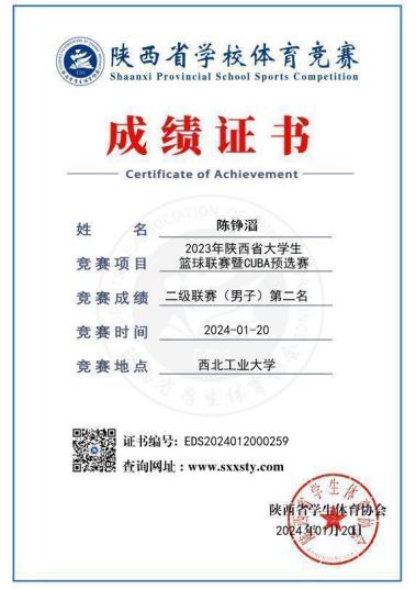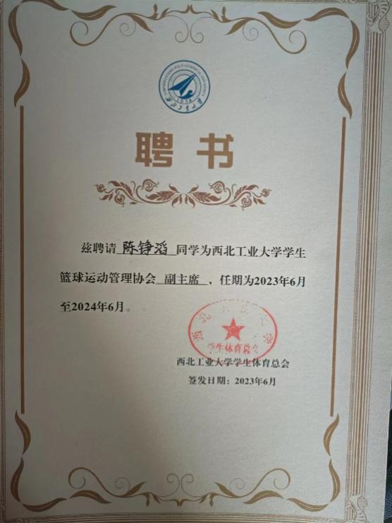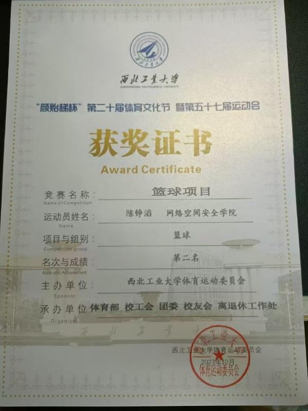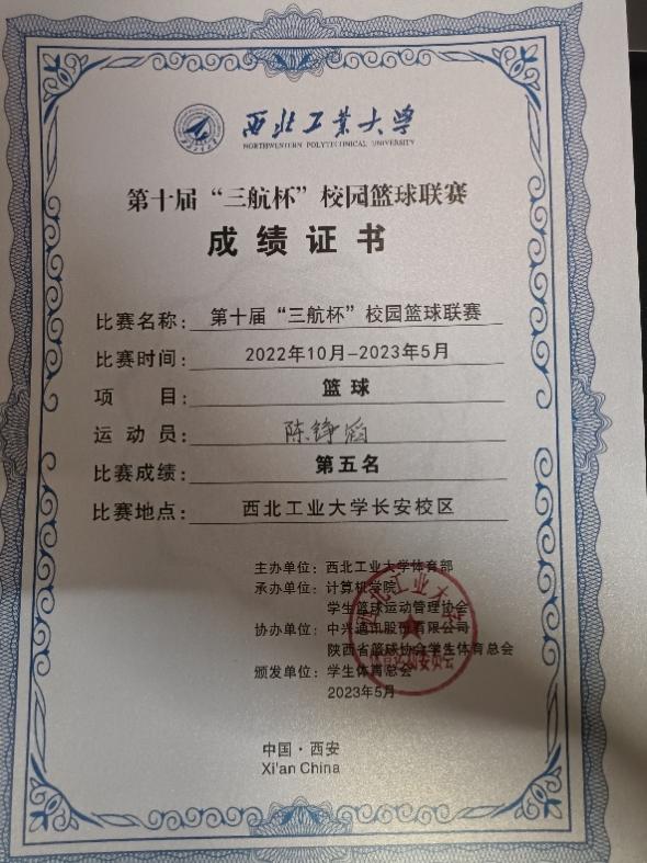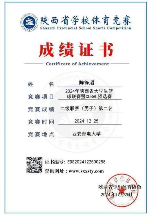 普通生男篮队长,曾代表学校征战第二十四、二十六届中国大学生篮球二级联赛全国总决赛和北区赛,连续取得优异成绩(全国总决赛第四名、北区赛第四名、总决赛第六名)。在陕西省级赛事中,他所在队伍三获亚军、一获季军,个人被评为“2023年省联赛优秀运动员”。此外,在校内“颜怡梯杯”“季忆留夏”等赛事中也多次夺冠,成为队友信赖、赛场尊重的核心力量。