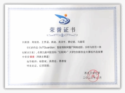 2023年“互联网+”大学生创新创业种子项目1项。立足本专业,带队参加“互联网+”大学生创新创业大赛、电子商务“创新、创意及创业”挑战赛、“翱翔杯”研究生电子设计大赛、“三航杯”大学生课外学术科技作品竞赛等,累计获得国家级三等奖1项、省部级一等奖1项、二等奖2项、校级特等奖1项、二等奖2项、三等奖5项。获国家奖学金、小米优秀专项奖学金、校设一等奖学金等,连续两年获评校级优秀研究生。