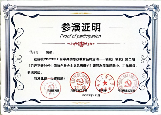 作为中共党员,蒋玉堂有着坚定的理想信念,紧跟党的步伐,积极参加“唱响新时代”合唱展演、党员读原著、第二届《习近平新时代中国特色社会主义思想概论》课程剧展演等各类党建和思政教育活动。