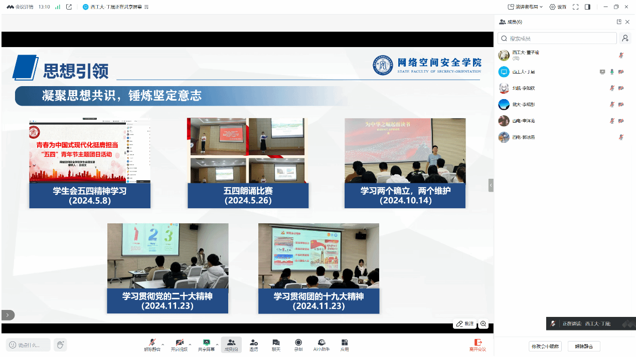 最后,西安电子科技大学网络与信息安全学院学生会主席团成员申泽龙详细介绍了学生会的组织架构、部门职能及过去一年的活动开展情况。西电网信院学生会下设四大核心部门,各部门职责明确、协同高效,在过去一年中成功举办了网络安全宣传周、趣味运动会、优秀班级评选、“同心杯”球类联赛等丰富多彩的校园文化活动。在日常工作中,学生会积极组织同学们参与各类志愿服务活动;在毕业季,还精心筹办了学院毕业晚会。值得一提的是,学院还特别成立了“网信先锋宣讲团”,为同学们提供专业的学业指导与帮扶,切实助力学生成长成才。