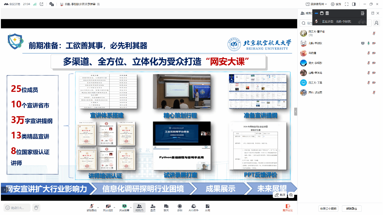 主席团成员李如钦介绍了北航网安学院学生会在2024年度的各项工作成果。在主席团的统筹协调下,学生会各部门分工合作,成功举办了多项与校学生会、北京学联的联合活动,创新性地开展了航空航天嘉年华等特色活动,极大丰富了同学们的校园文化生活。同时,北航的网络空间安全宣讲团在暑假期间走进了多个省市,开展了广泛而深入的宣讲活动,同时也围绕网络安全行业的落地现状进行了调研,为全国多个地方建立网络空间安全基地,提高了公众的网络安全意识。此外还在科技成果和宣传活动方面有所建树。