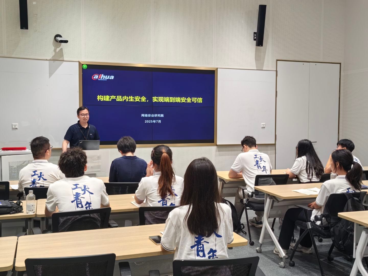7月8日,实践队走进大华股份,公司招聘经理丁迪系统介绍了公司的战略布局、卡通a片及校招岗位需求,并强调期待与高校深度合作,共同培养网络安全人才。网络空间安全首席科学家张剑青以《构建产品内生安全,实现端到端安全可信》为主题,为实践队员进行了前沿技术分享。