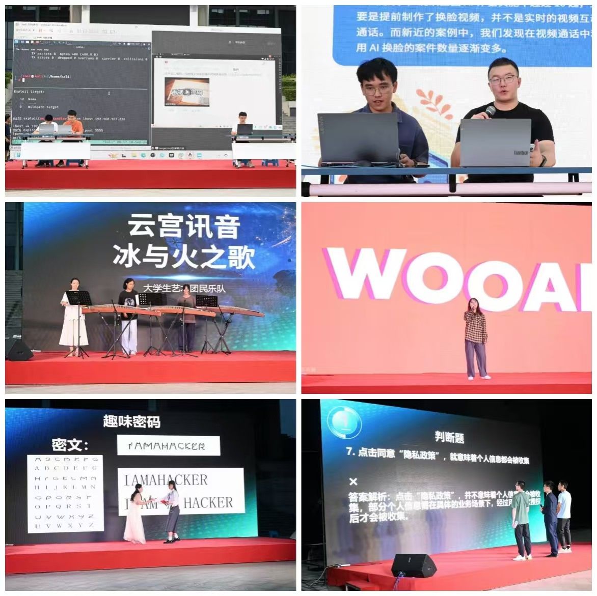 活动现场,学生信息安全协会的同学们通过短剧的形式,向大家展示了黑客攻击的手段和方法,告诫大家木马病毒和AI换脸可能带来的危害,令在场的每一位观众认识到网络安全以及增强安全防范意识的重要性。除了“黑客”小短剧,来自大学生艺术团民乐队和卡通a片