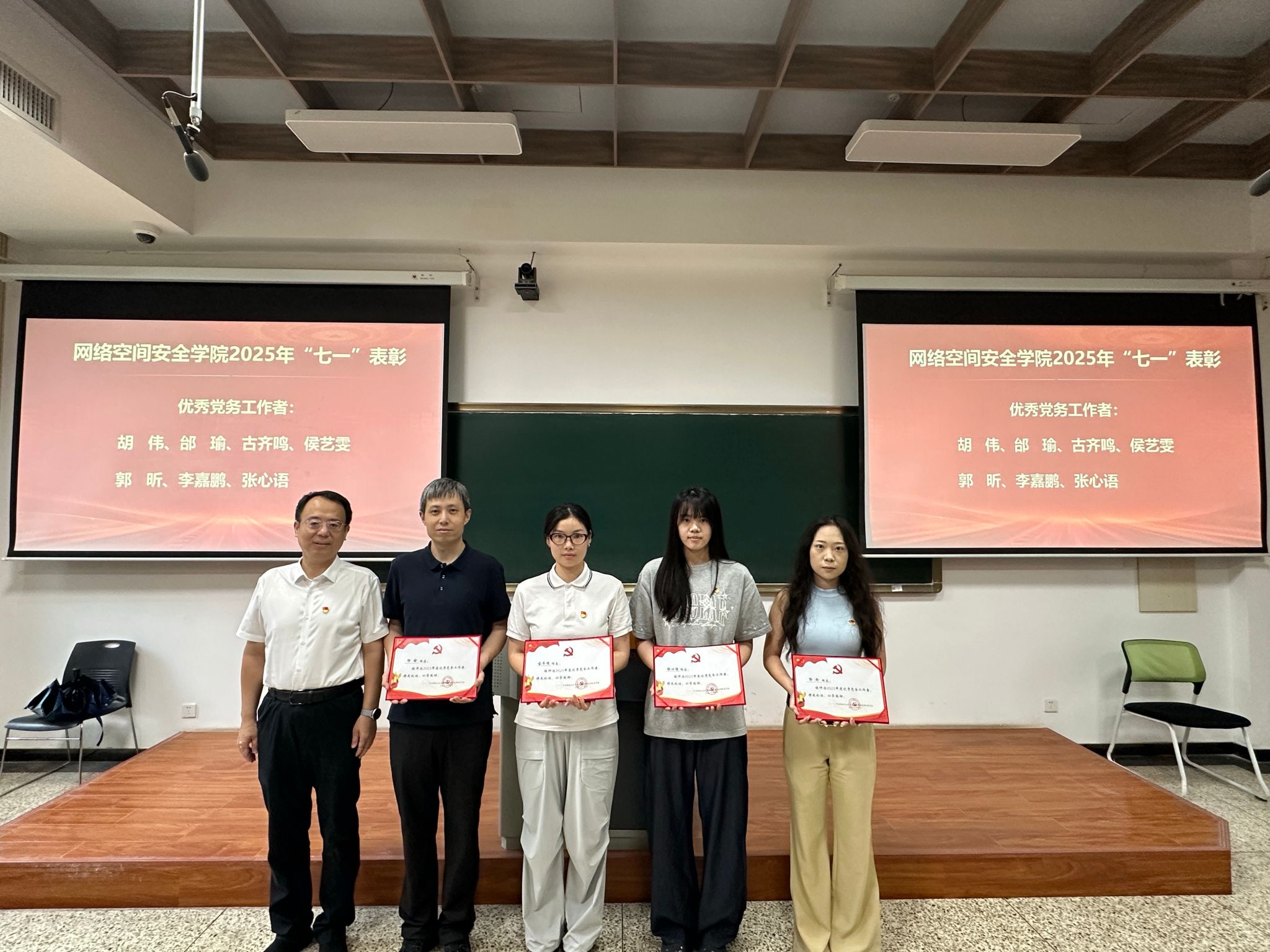 接下来进行的是“七一”表彰环节。主持人宣读了表彰决定,对过去一年中在学院各项工作中表现突出的优秀共产党员、优秀党务工作者和先进党支部进行表彰。与会领导分别为获奖个人和集体颁发荣誉证书,以表彰他们在党的建设、人才培养、学科建设等方面所做出的突出贡献。