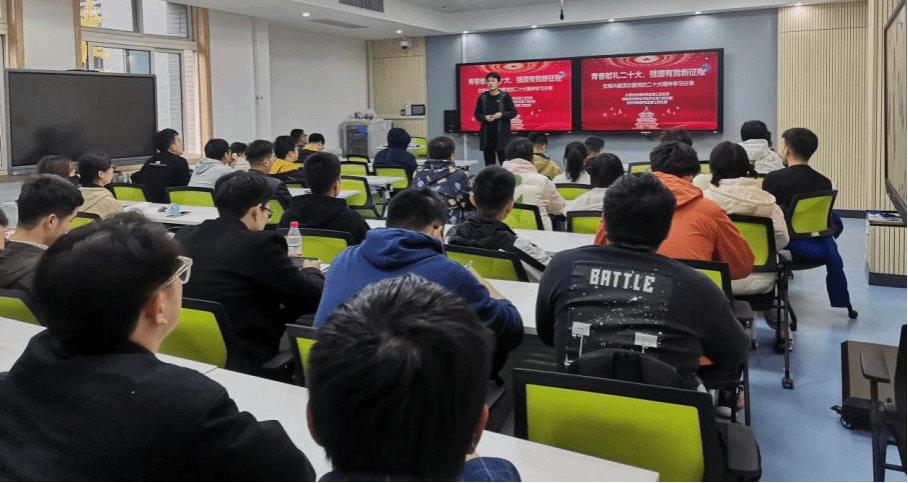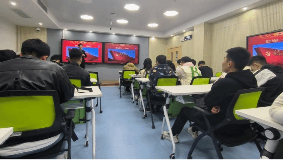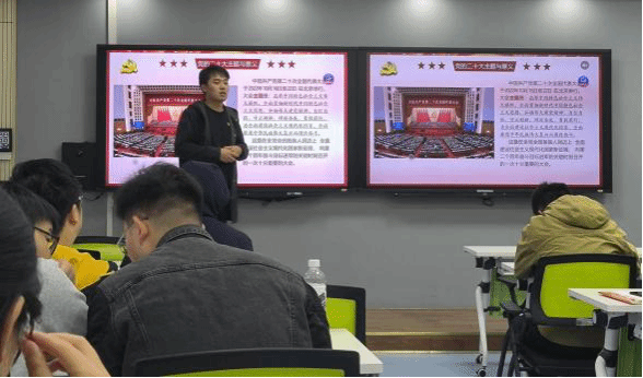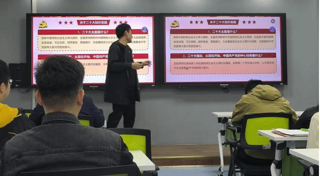 主题党日第一个环节是通过问答形式集中学习党的二十大精神内容。以问答的形式对党的二十大进行回顾,激发同学们学习热情的同时,有效提升了学习效果。问答题目包含党的二十大主题、党的中心任务等,同时对党的一大到党的十九大期间的主要内容进行了简要回顾。