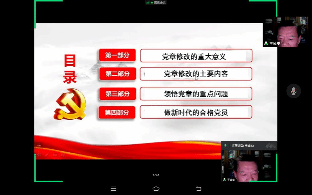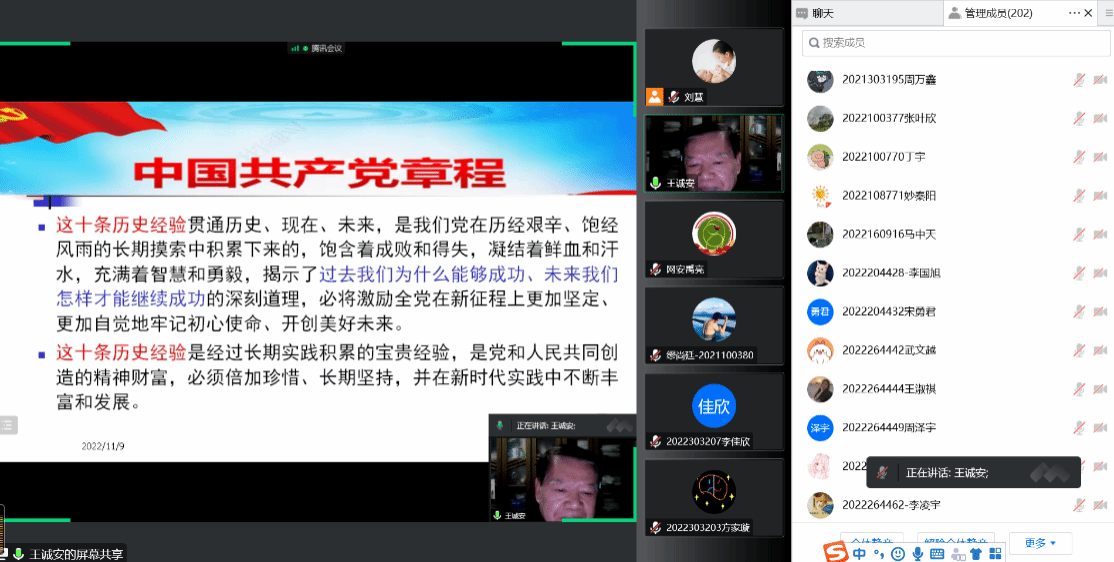 邀请中共陕西省委党教科社部原主任王诚安教授为学院师生辅导解读中国共产党第二十次全国代表大会通过的《中国共产党章程(修正案)》。此次党课由学院党总支副书记禹亮主持,学院领导班子、师生党员、发展对象、入党积极分子共二百余人参加党课,根据疫情防控要求,党课采取线上形式召开。